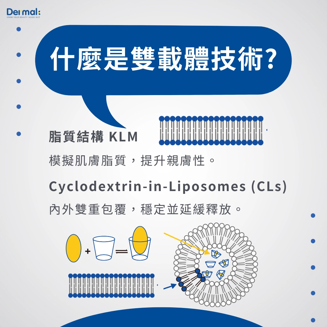 傳統單一載體在傳輸保養成分時,容易停留在角質層表面,效果有限。DMK採用的瑞士雙載體技術,結合: