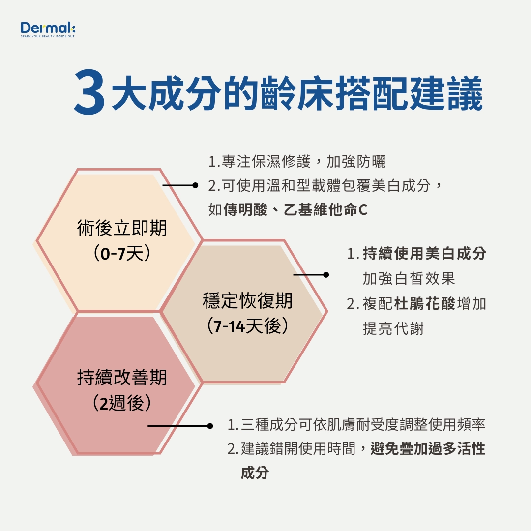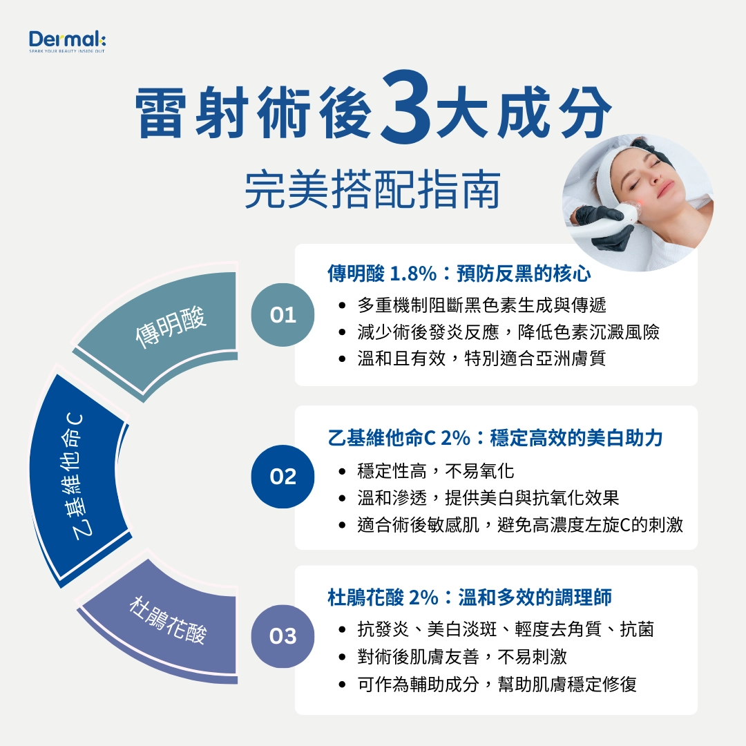 雷射術後的美白保養不應該是盲目的成分堆疊,而是要理解每個成分的特性,在適當的時機以正確的方式使用。透過傳明酸的多重調節、3-O-乙基維他命C的穩定抗氧化、杜鵑花酸的溫和輔助,這三者的完美搭配能幫助肌膚在雷射治療後達到更理想的狀態。