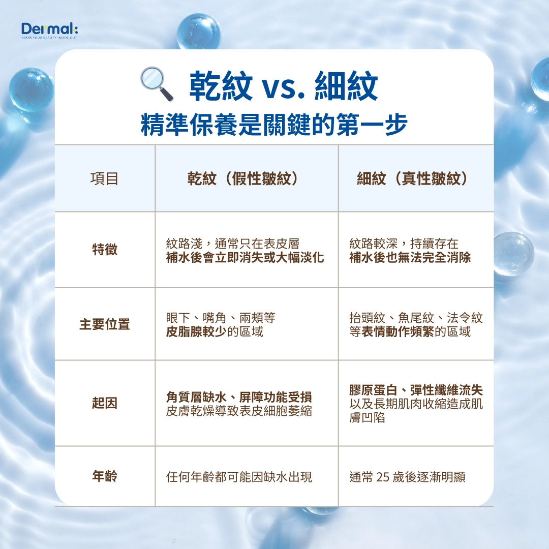 了解紋路屬性後,保養重點就要有所區分:💧 針對乾紋:長效深度保濕與屏障修護
