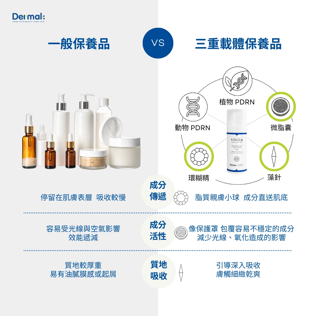 和一般「只是在乳霜裡加PDRN、沒有載體設計」的產品相比,三重載體帶來幾個實際差異: