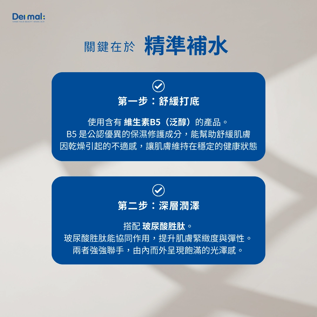 關鍵在於「精準補水」:推薦產品 KAM活力B5保濕精華 + 玻尿酸肌活胜肽
