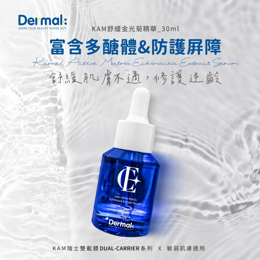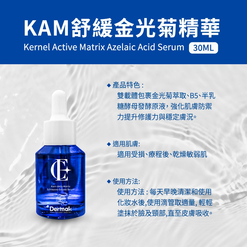 用途:本產品使用創新配方KAM(Kenel Active Matrix), KAM為脂質結構KLM (Kernel Lipid Matrix)結合專業劑型 Cyclodextrin-in-Liposomes (CLs)包裹半乳糖酵母發酵原液(GFF)的組合, KAM可增進總體成分釋放及吸收,此外另再包裹金光菊根萃取, 整體兼具高效&長效的快速舒緩與修護逆齡之功效。 用法:每天早晚清潔和使用化妝水後,使用滴管取適量, 輕輕塗抹於臉及頸部, 直至皮膚吸收。 注意事項:僅依上述指示使用。勿吞食及避免接觸眼睛。 若有不適現象, 請立即停止使用並諮詢皮膚科醫師。