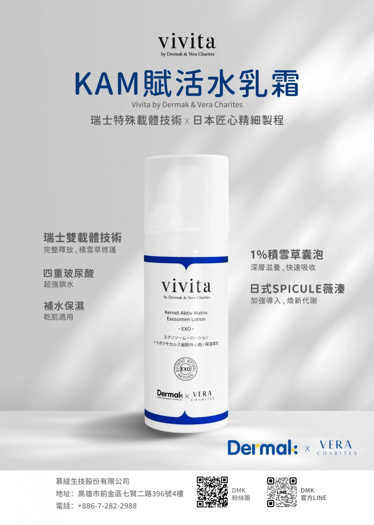 Dermak X Vera 瑞士特殊載體技術 X 日本匠心精細製程。 添加1%積雪草以及日式SPICULE薇溱,能加強導入、精準吸收、煥然一新!四重玻尿酸超強鎖水,乾肌適用。