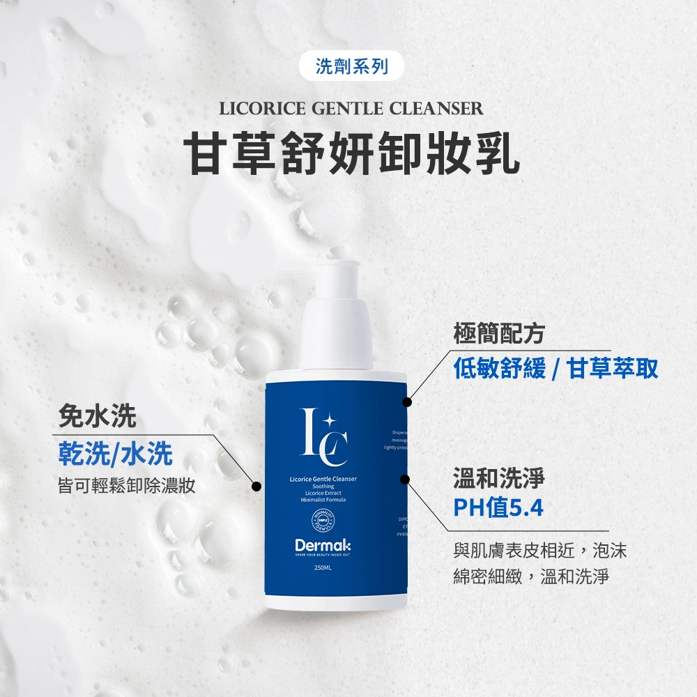 免水洗極簡配方,溫和清潔不刺激,質地清爽不油膩,含甘草萃取成分,舒緩同時修護敏弱肌膚,輕鬆卸妝不熏眼。